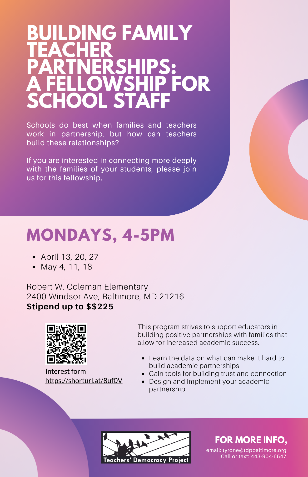 TDP engages teachers, parents and community members in Fellowship Projects. Fellows are working on: Restorative Practices and bullying, socially engaged curriculum, and parent power. By proactively connecting teachers, parents and community members we aim to transform school relationships, culture and the way decisions get made.